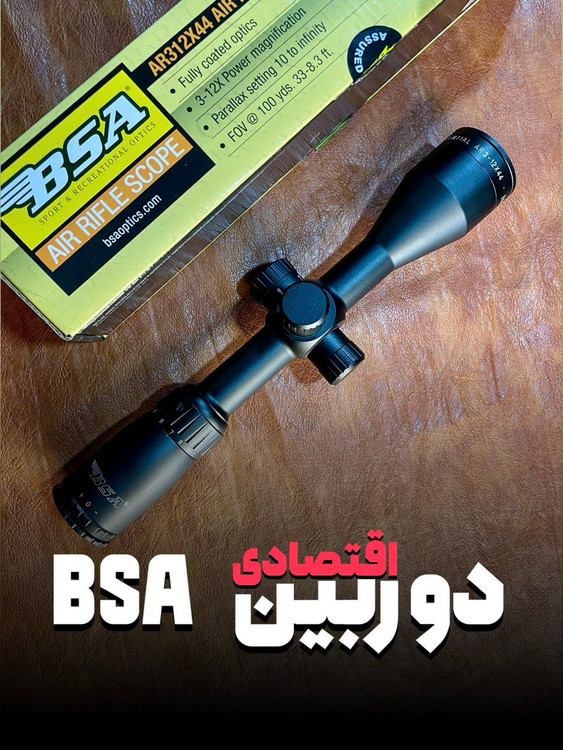 دوربین تفنگ بادی BSA AR312X44 یکی از مدلهای محبوب و کارآمد شرکت BSA Optics است که برای تیراندازان حرفهای و علاقهمندان به شکار طراحی شده است. این دوربین با بزرگنمایی متغیر 3 تا 12 برابر و دهانه لنز 44 میلیمتر، ترکیبی از قدرت و وضوح را ارائه میدهد و در شرایط مختلف نوری عملکرد عالی دارد